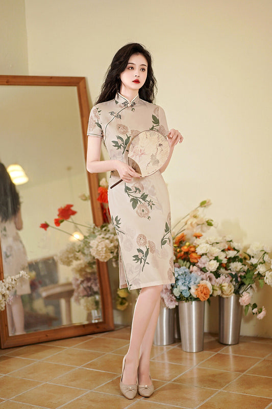 New Ladies Chinese Vintage Almond White Floral Prints Trim Dress Cheongsam Qipao