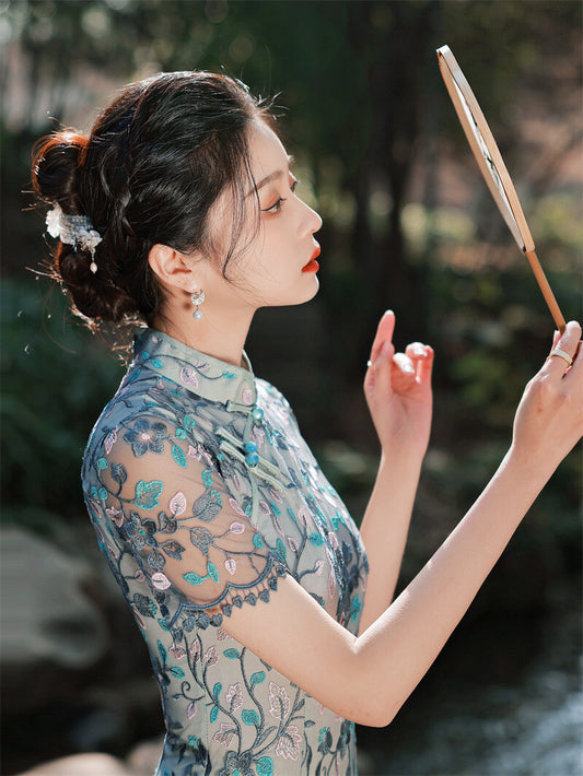 New Luxurious Chinese Aqua Blue Lace Floral Short Cheongsam Qipao Dress