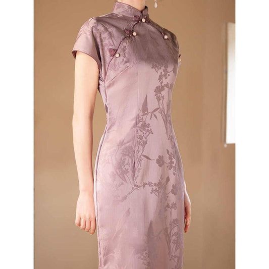Purple Satin Chinese Qipao Dress Subtle Floral Embroidery and Pearl Buttons