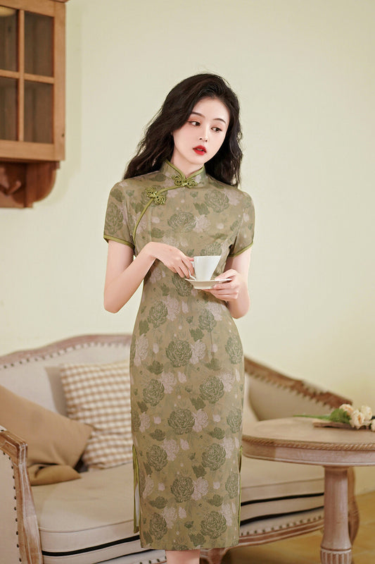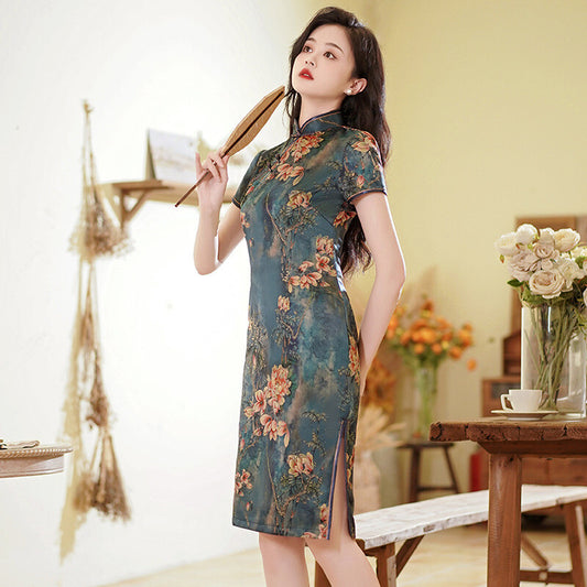 New Ladies Chinese Vintage Green and Floral Prints Trim Dress Cheongsam Qipao