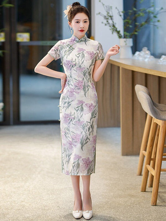 New Blossoming Elegance Chinese Lilac Floral Prints Long Cheongsam Qipao Dress