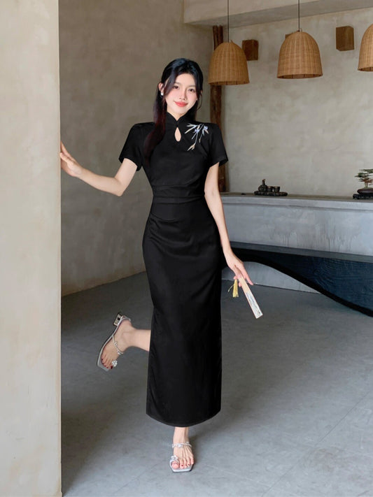 New Traditional Ladies Chinese Bamboo Prints Black Long Qipao Cheongsam Dress