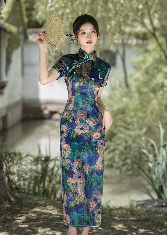 New Chinese Elegant Blue and Green Watercolour Long Cheongsam Qipao Dress