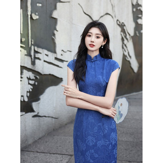 Elegant Blue Jacquard Chinese Qipao Dress with Floral Motif and Cap Sleeves