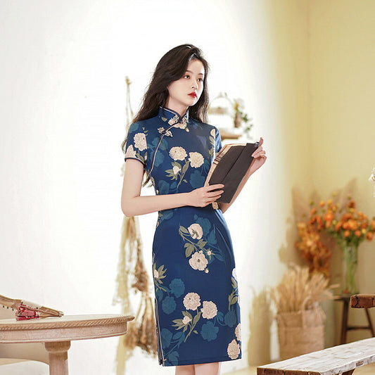 New Luxurious Satin Chinese Porcelain Blue Floral Prints Dress Cheongsam Qipao