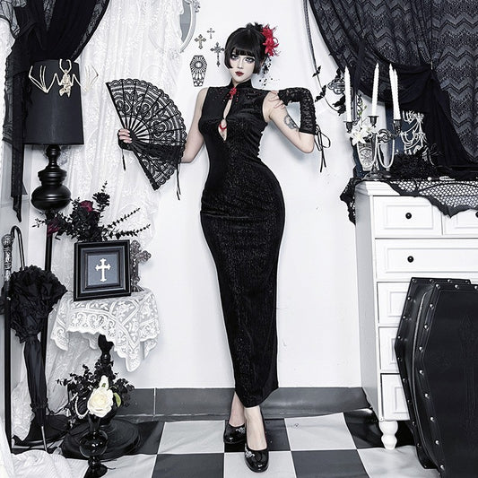 Black Gothic Velvet Chinese Qipao Cheongsam Dress with White Lily Embroidery