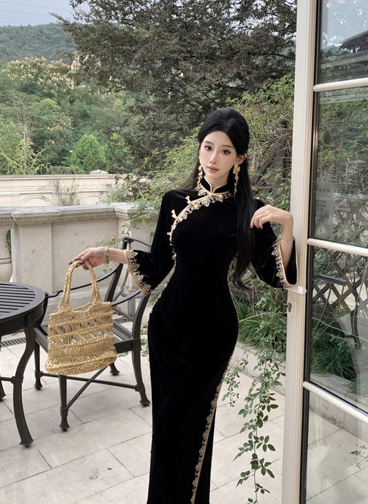 Black Velvet Chinese Qipao Dress with Gold Lace Trim & Mandarin Collar Cheongsam