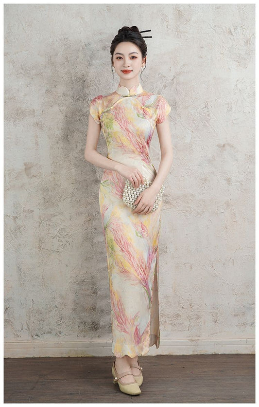 Elegant Pastel Floral Qipao with High Slit – Classic Chinese Cheongsam Dress