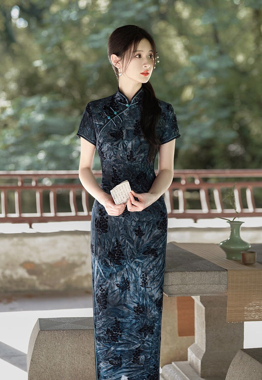 New Luxurious Velvet Chinese China Blue Jacquard Long Dress Cheongsam Qipao