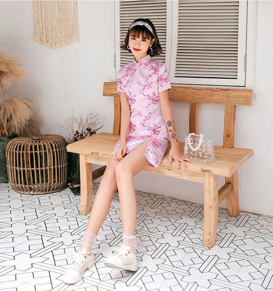 New Luxurious Satin Chinese Pink Floral Short Dress Cheongsam Qipao lcdress173