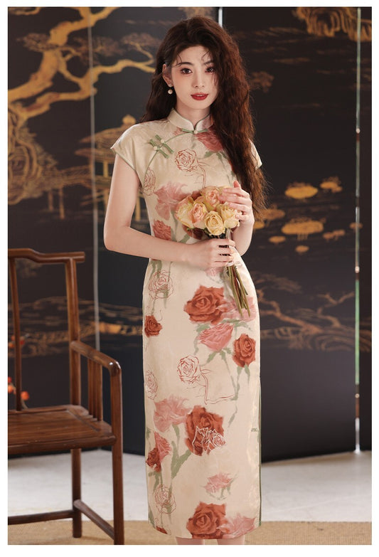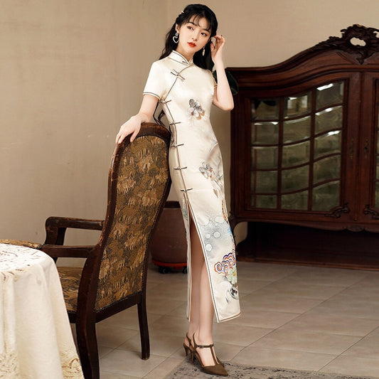 Elegant Floral Satin Chinese Qipao Cheongsam Dress – Timeless Oriental Charm