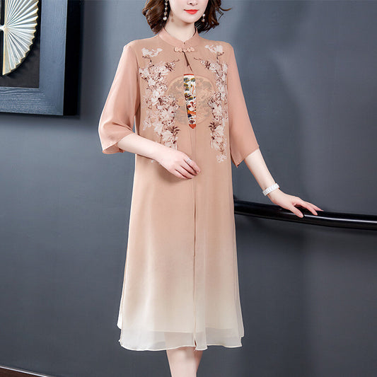 Luxurious Chinese Chiffon Knee Length Almond Faux 2Piece Cheongsam Qipao Dress