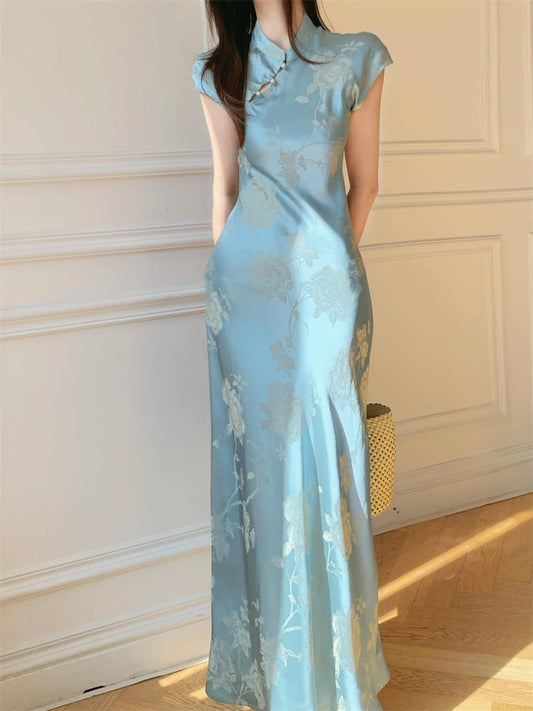 Luxurious Elegant Blue Silk Qipao with Floral Jacquard – Modern Cheongsam Gown