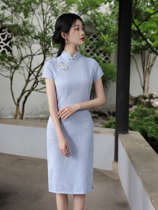 Serenity Sky: Light Blue CottonLinen Qipao Cheongsam Dress OvertheKnee Length