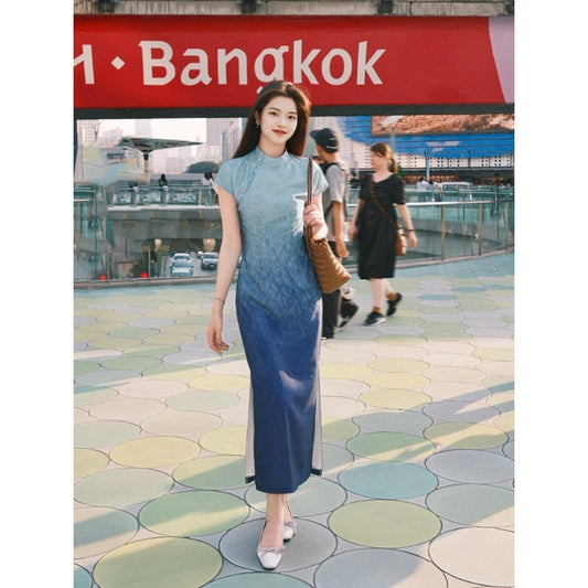New Elegant Oriental Grace Chinese Gradient Blue Qipao Cheongsam Textured Dress