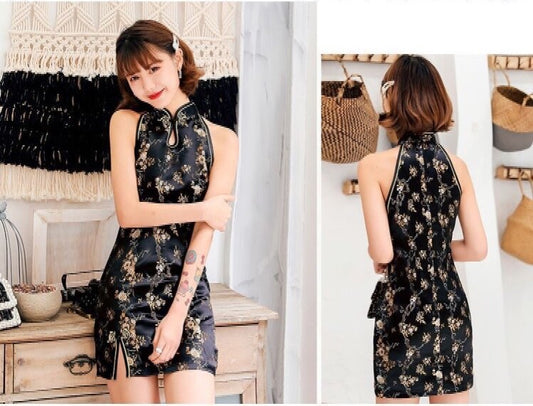 Luxurious Chinese Sleeveless Black Floral Short Dress Cheongsam Qipao lcdress198