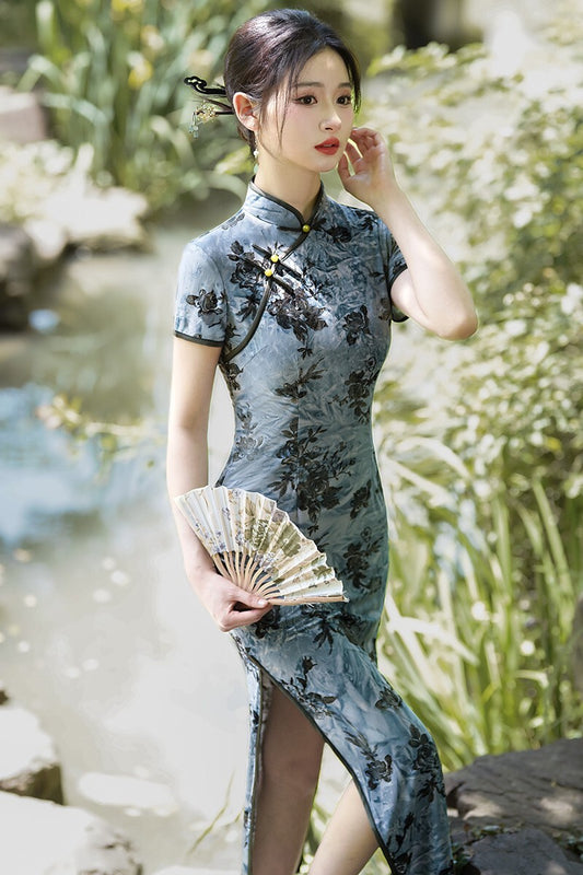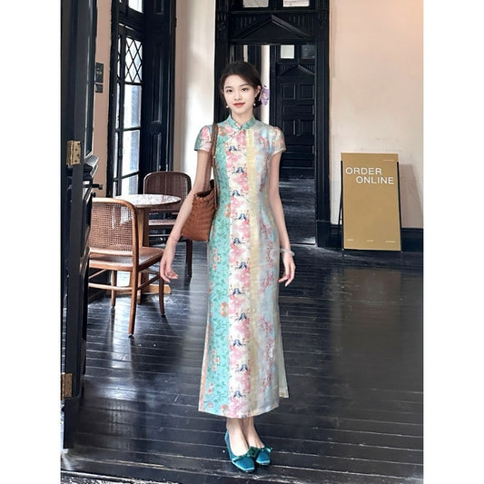 New Chinese Elegant Blue and Green Watercolour Long Cheongsam Qipao Dress