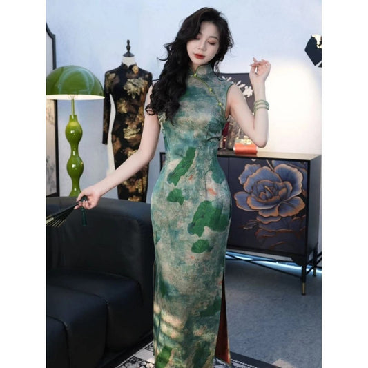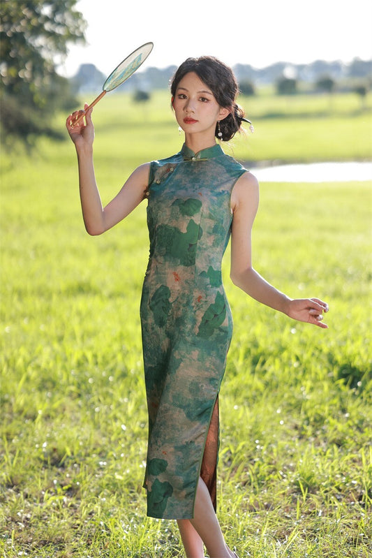 New Elegant Oriental Grace Chinese Green Ink Landscape Qipao Cheongsam Dress