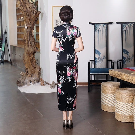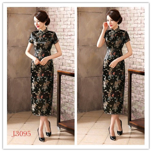New Luxurious Black Satin Phoenix Chinese Long Dress Cheongsam Qipao lcdress49