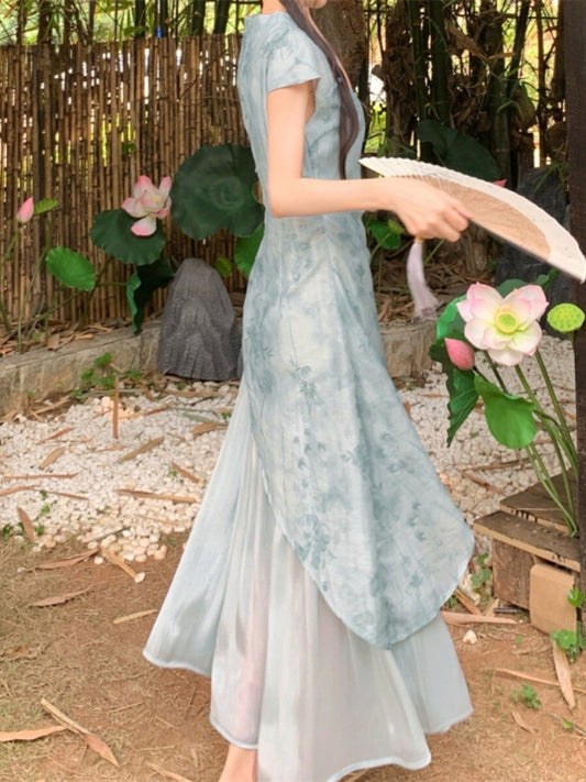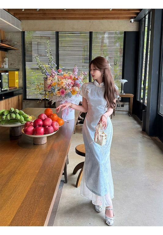 Serene Light Blue Qipao Dress with Graceful Floral Details & Contemporary Twist