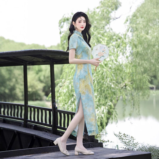 Elegant Chinese Qipao Cheongsam Dress – Floral Green Satin with Sheer Sleeves