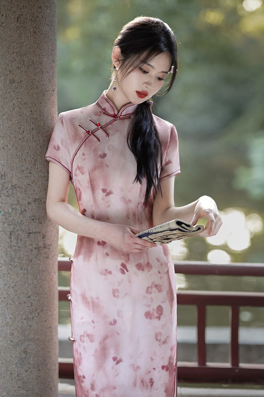 Blush InkWash Qipao with Red Knot Buttons and Graceful Chinese Cheongsam Dress