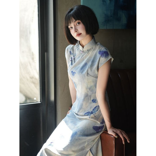 Watercolour Butterfly Qipao with Soft Hues Lilac Button Chinese Cheongsam Dress