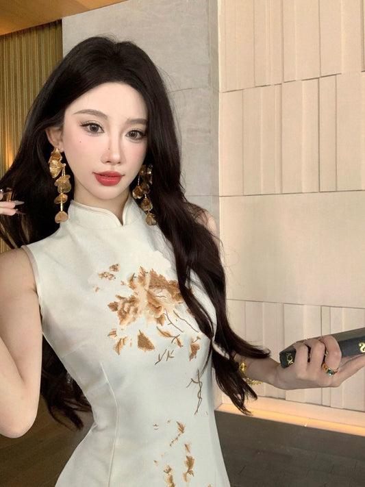 Ivory Sleeveless Qipao with Golden Embroidery & Classic Chinese Cheongsam Dress