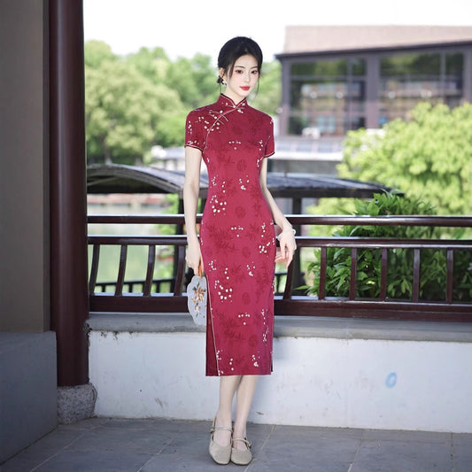 Elegant Red Cherry Blossom Qipao with Bamboo Pattern Chinese Cheongsam Dress