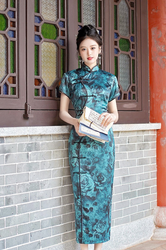 Teal Rose Jacquard Qipao with Black Trim and Side Slit Chinese Cheongsam Dress