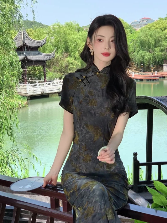 Elegant Butterfly Print Navy Qipao Dress Gold Floral Chinese Cheongsam Dress