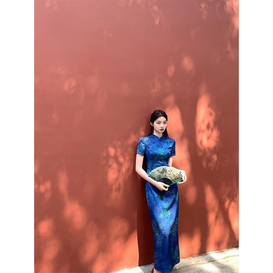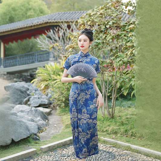 Elegant BlueGold Gradient Qipao with Botanical Brocade Chinese Cheongsam Dress