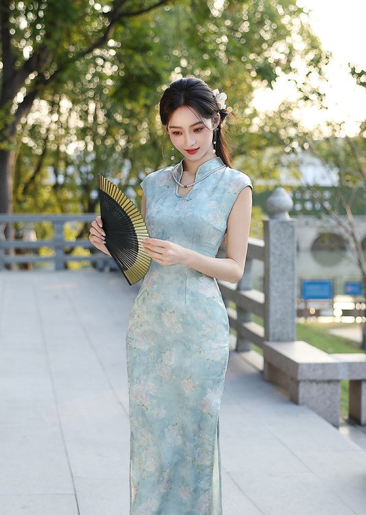 Light Green Floral Qipao Dress Long Chinese Cheongsam Elegant Slim Fit Gown