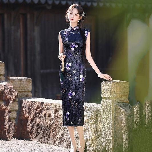 Black Purple Floral Qipao Dress Long Chinese Cheongsam Elegant Slim Fit Gown