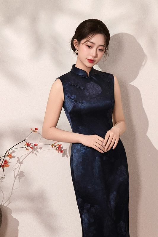 Navy Blue Qipao Dress Long Chinese Cheongsam Elegant Slim Fit Sleeveless Gown