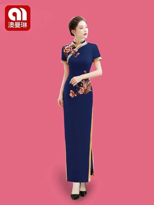 Navy Blue Embroidered Qipao Cheongsam with Gold Trim & Side Split