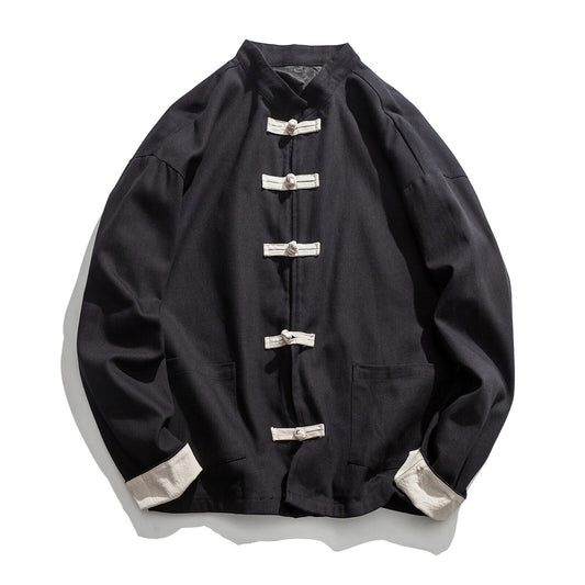 New Men's Chinese Kung Fu Style Black Jacket with Traditional White Fastenings
