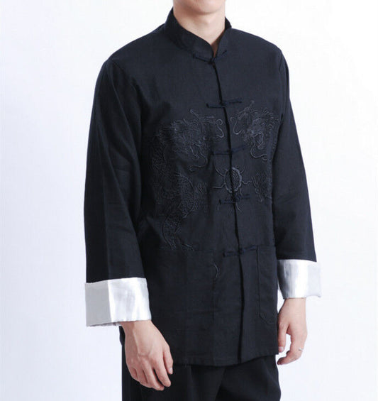 Double Dragons Chinese Oriental Mens Kung Fu Flax Dragon Top Long Shirt cmssh14
