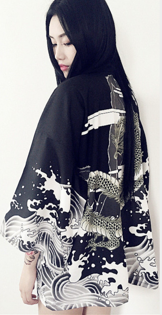 Womens Ladies Chinese Japanese Oriental Kimono Style Black Dragon Top ltop8