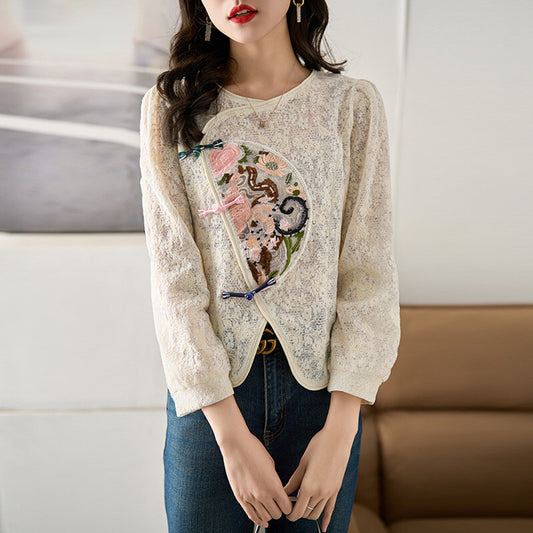 New Exquisite Ladies Lace Chinese Style Shirt with Floral Embroidery Detail