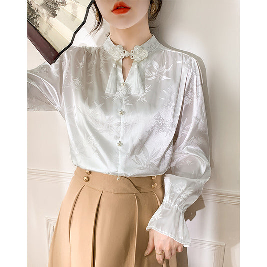 New Elegant Chinese White Satin Blouse with Bamboo Print & Embellished Collar