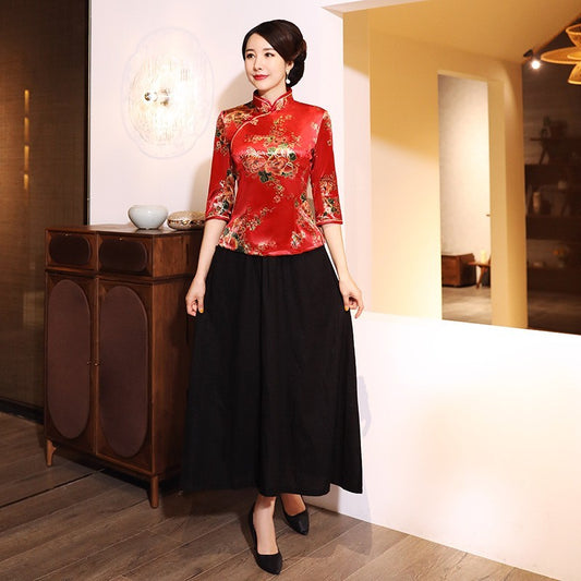 Elegant Red Velvet Floral Chinese Ladies Top with Mandarin Collar & Frog Buttons
