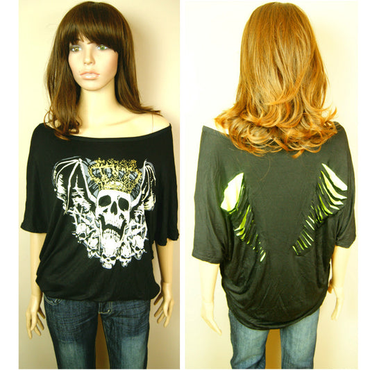 New 812 Womens Ladies King of Skull Bat Style Shoulder Black Loose Top TShirt