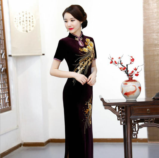 New Velvet Purple Phoenix Flowers Chinese Long Dress Cheongsam Qipao lcdress89