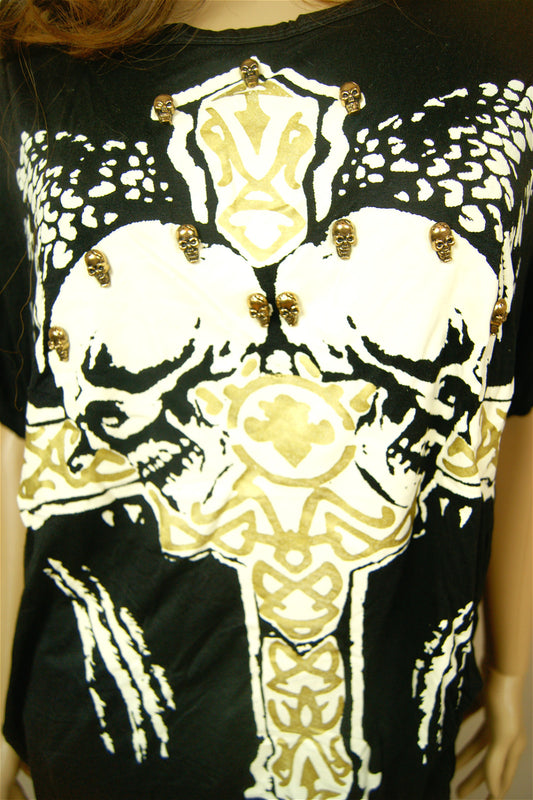 812 Womens Ladies Black Golden Cross Skull Studs In Black Loose Top TShirt
