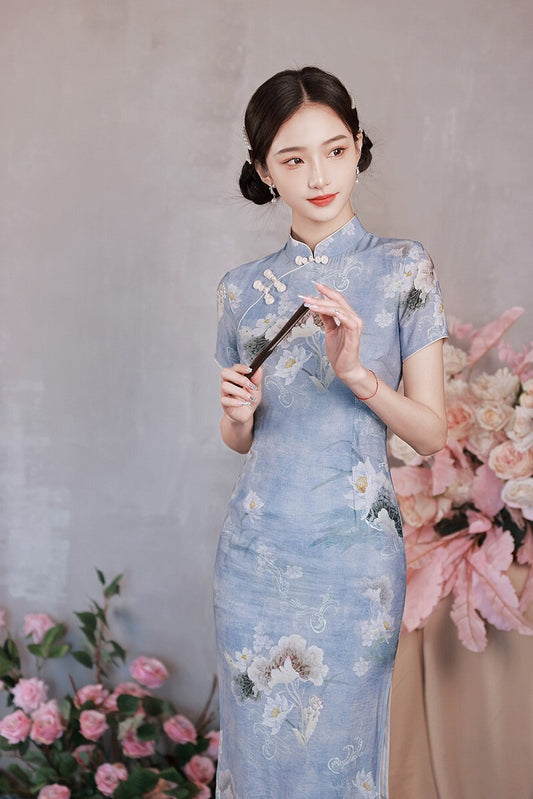 Sky Blue Lotus Chinese Qipao Dress Pearl Detail and Watercolour Floral Print
