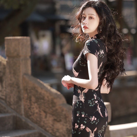 New Luxurious Chinese Asian Black Heaven Cranes Short Dress Cheongsam Qipao