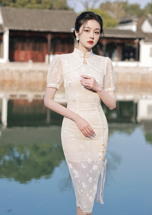 New Luxurious Chinese Asian Ivory White Floral Prints Long Dress Cheongsam Qipao