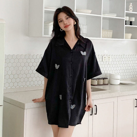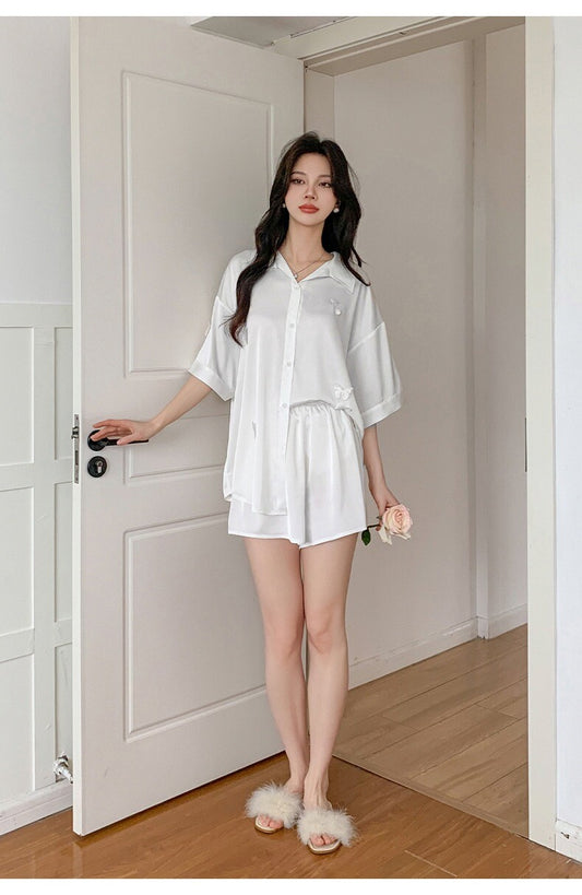 Elegant Womens Synthetic Silk Pyjama Set Long Shirt Style Top with Elastic Short