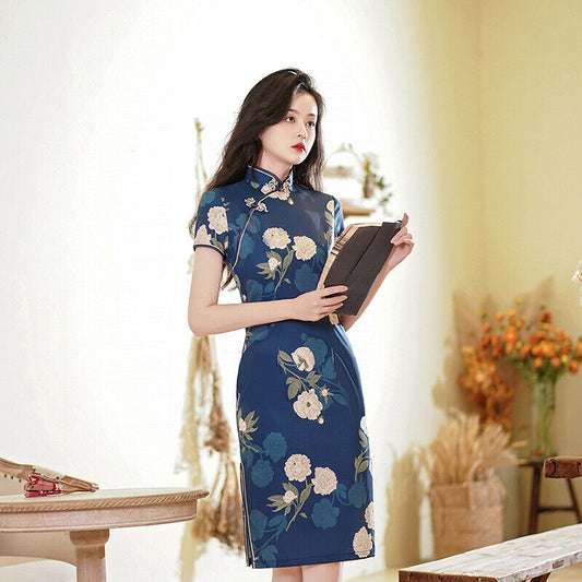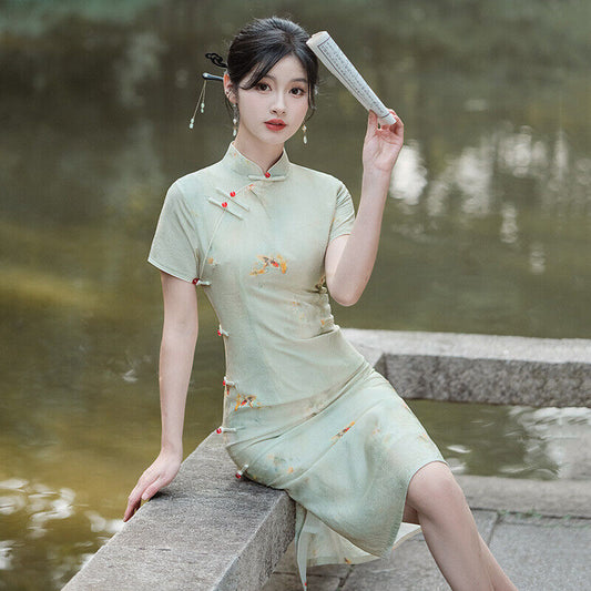 New Ladies Chinese Vintage Green and Floral Prints Trim Dress Cheongsam Qipao